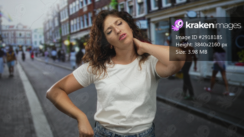 Woman with hand on neck on a busy city street, eyes closed and shoulder tensed, hand pressing neck for neck pain; urban fatigue.