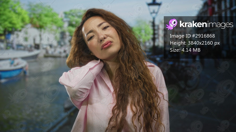 Woman with hand on neck on amsterdam street by canal boats and bikes, showing neck pain; discomfort.