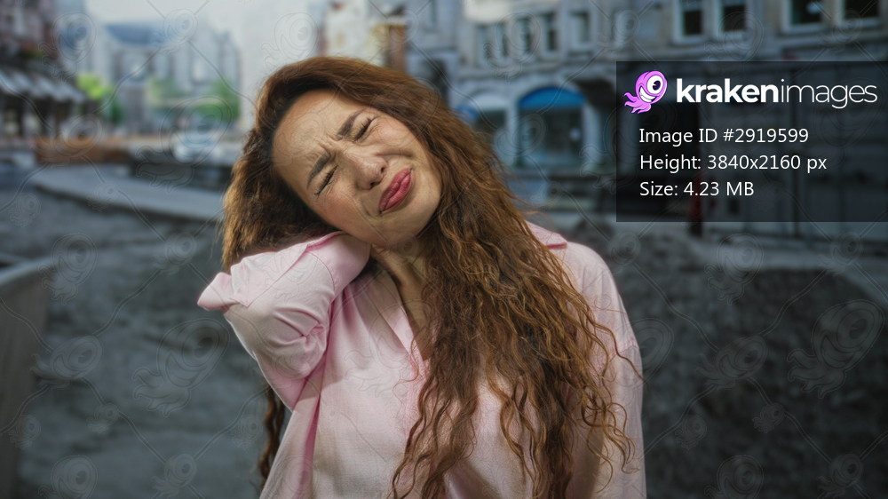 Woman with hand on neck on street by construction rubble and buildings, wearing pink shirt and long curly hair, grimacing; pain.
