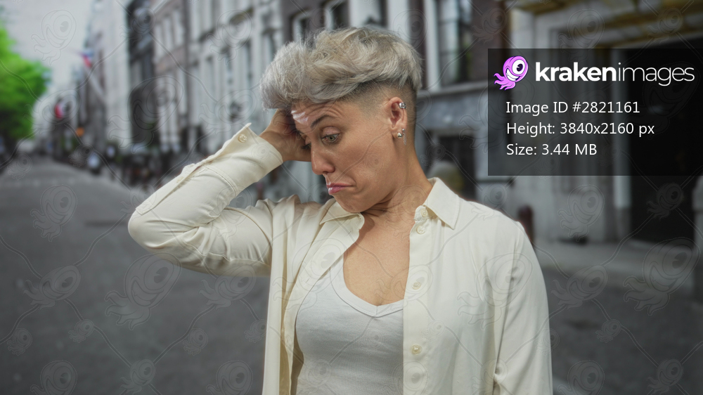 Woman with hand on neck and thoughtful gaze wearing a white tank top and open shirt on street; uncertainty.