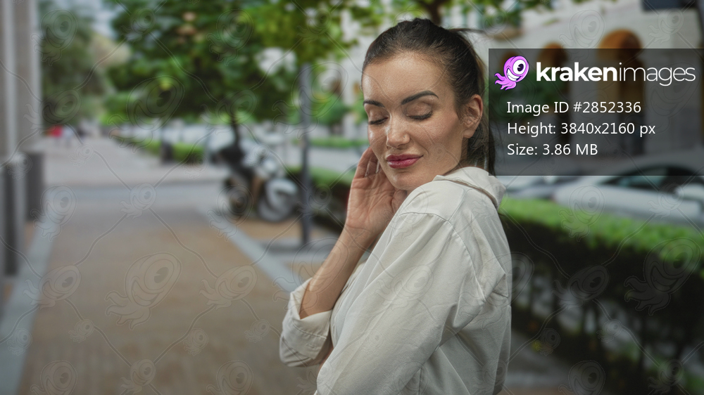 Woman with hand on neck wearing white shirt stands on city street lined with trees and parked cars; confidence.
