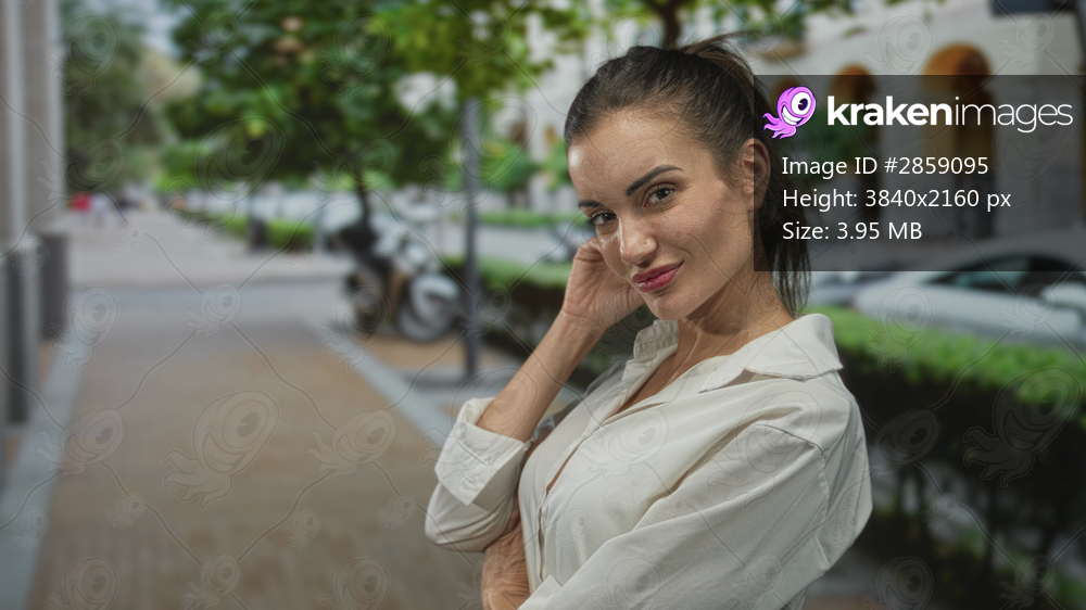 Woman with hand on neck wearing white shirt stands on city street lined with trees and parked cars; confidence.