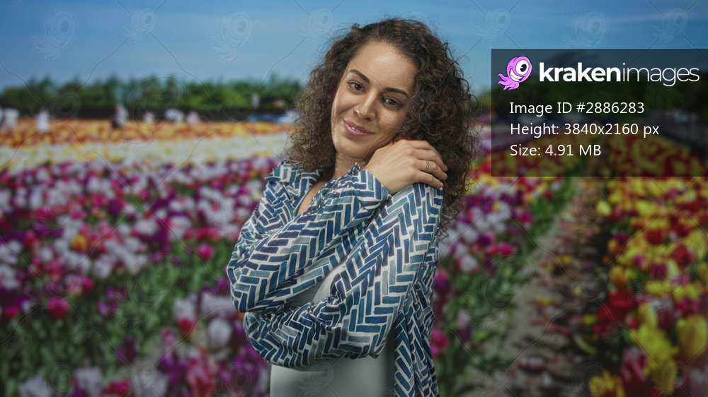 Woman with hand on shoulder in studio tulip field wearing open shirt over tank top, gentle self hug; serenity.