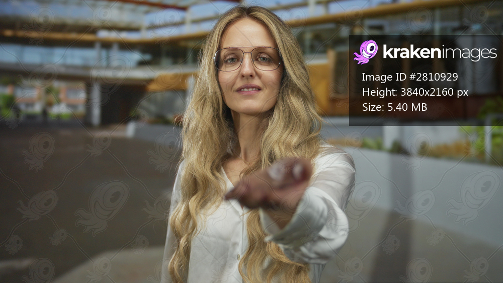 Woman hand outstretching outdoors young blonde happy gesture photo scene captures inviting friendly mood under daylight.