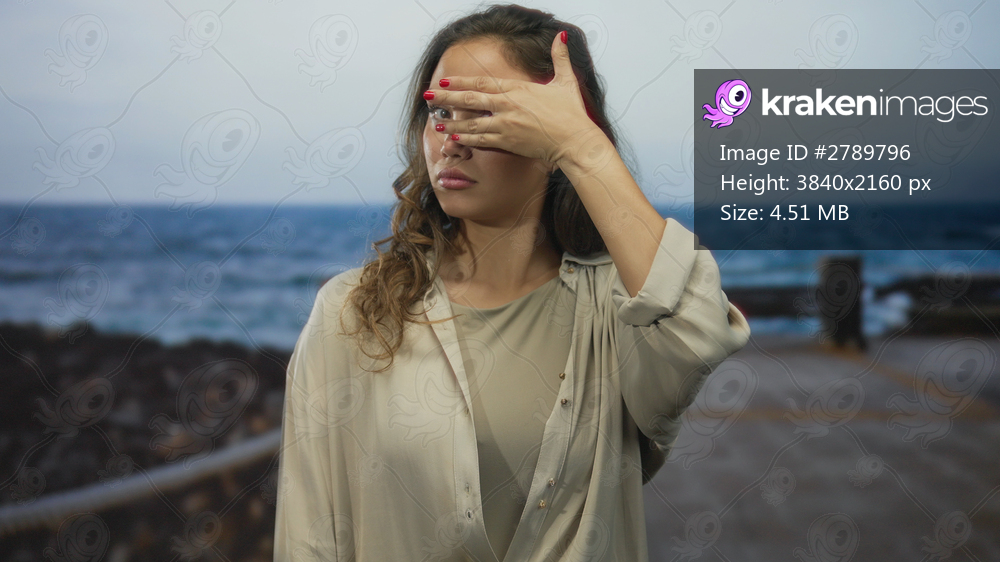 Woman with hand over face stands by the seaside on a promenade in an outdoor setting, capturing the essence of youthful curiosity and coastal tranquility under the ocean breeze. - Kraken Images