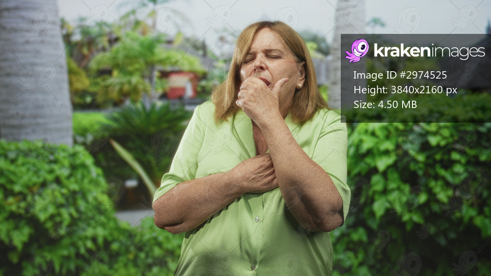 Woman with hand over mouth coughing and clutching chest in resort garden amid palms and hedges; distress.