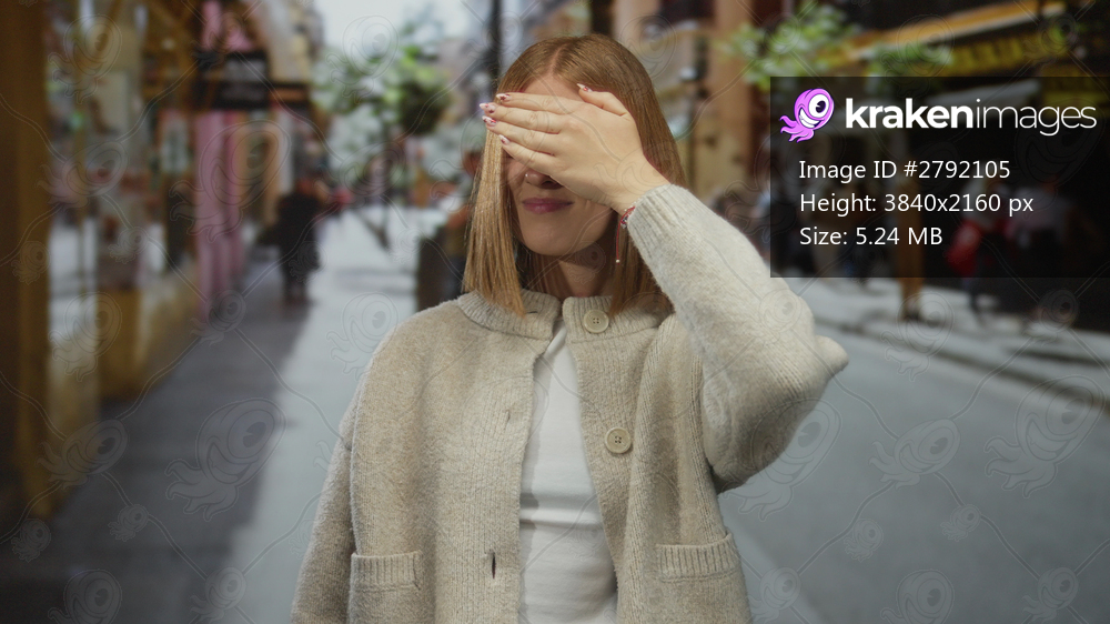 Woman with hand over mouth and eyes standing on urban street, expressing surprise, with buildings lining the bustling city scene in the background.