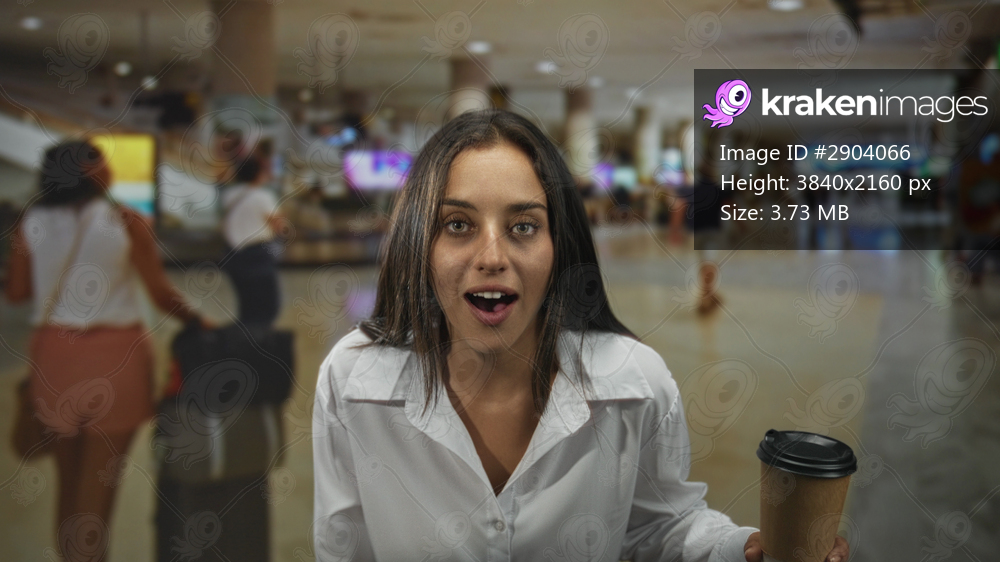 Woman with hand over mouth holding coffee cup at airport terminal while wearing white shirt; surprise travel moment.