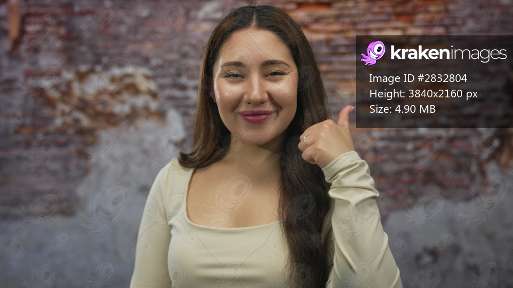 Woman with hand raised giving thumbs up gesture in a brightly lit studio against a weathered brick wall; optimism confidence.