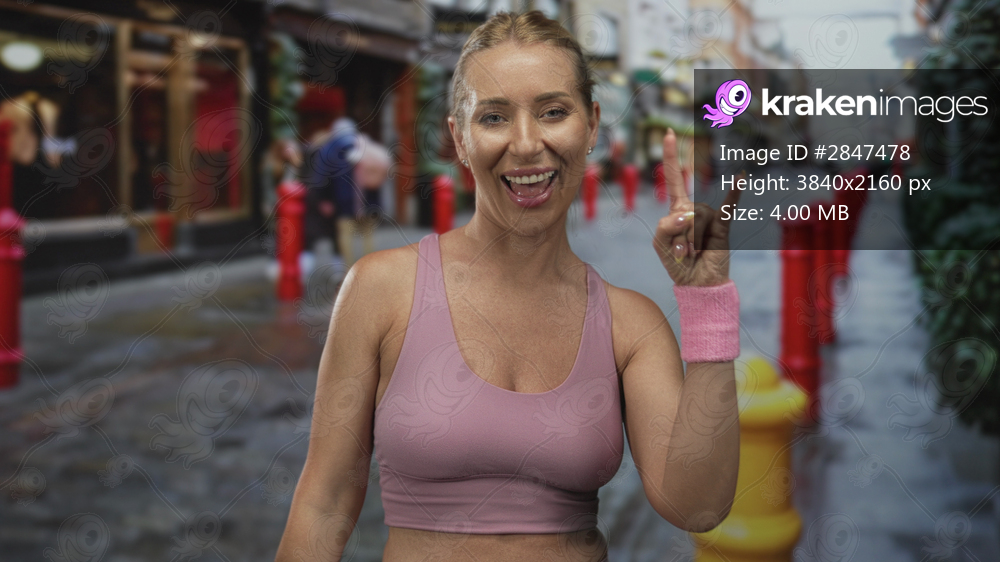 Woman hand raised in rock horns gesture on a busy urban street with storefront facades; fun rock joy.