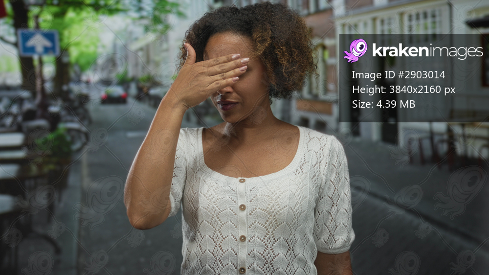 Woman hand raised palm out for stop gesture on street with eyes closed and furrowed brow; defiance boundary.