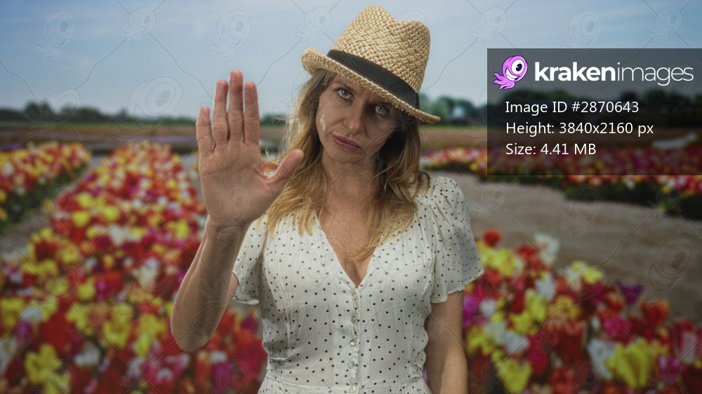Woman with hand raised palm out stop gesture in a colorful tulip field wearing straw hat and white polka dot dress; personal boundary refusal.