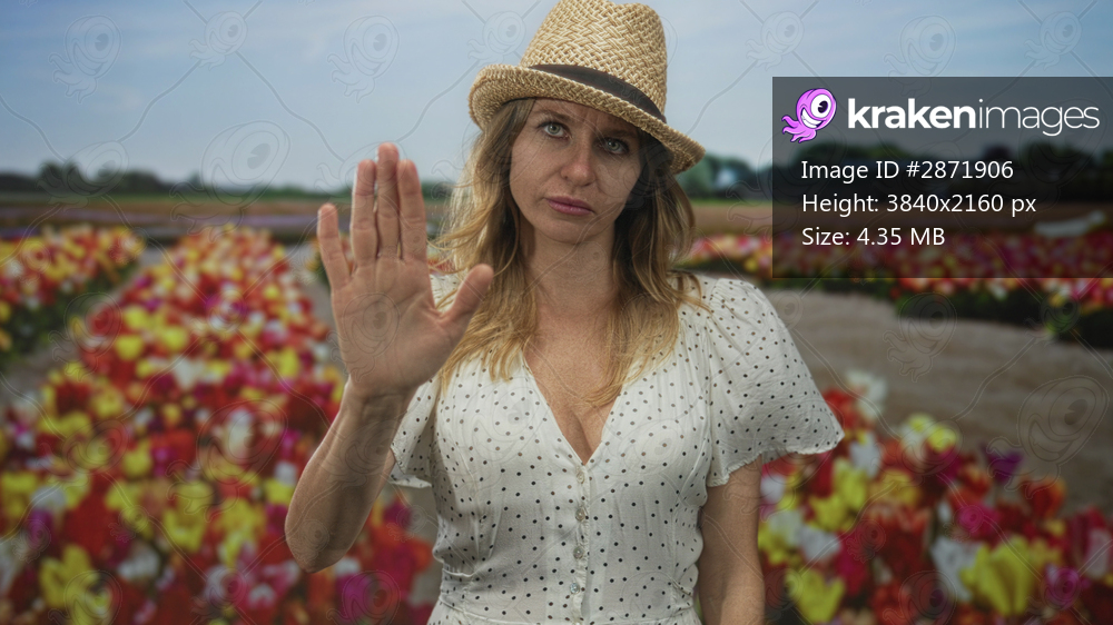Woman with hand raised palm out stop gesture in a colorful tulip field wearing straw hat and white polka dot dress; personal boundary refusal.