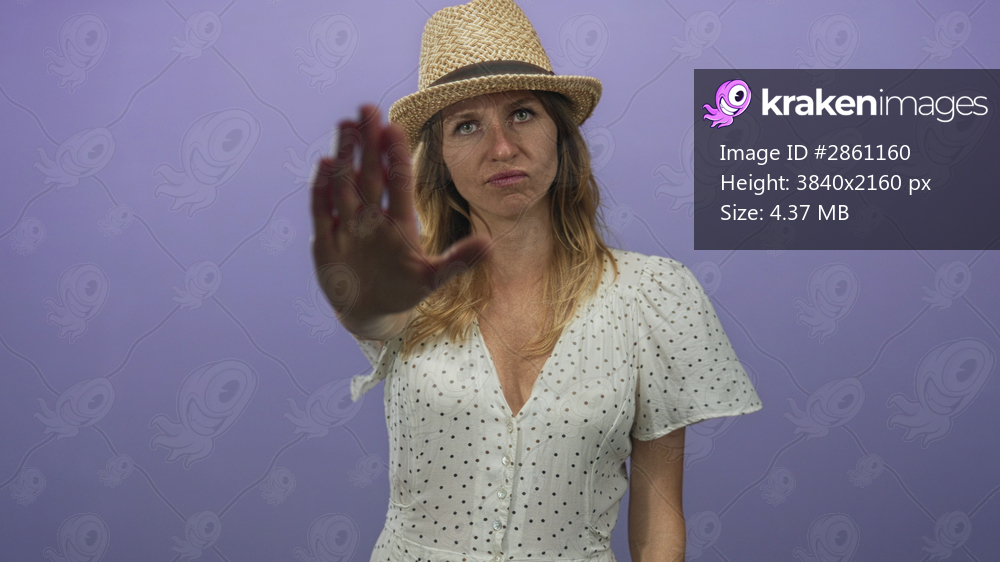 Woman with hand raised palm out stop gesture, wearing straw hat and white polka dot dress in lavender studio; boundary refusal.