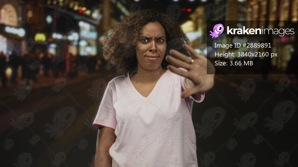 Woman with hand raised palm out to camera on busy street at night, wearing pink t shirt and frowning; defiance personal boundary.