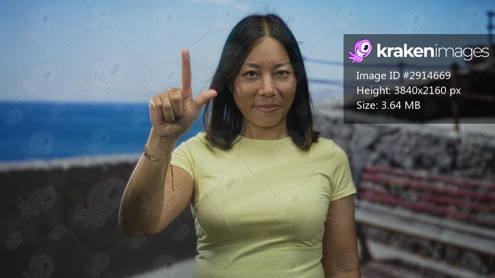 Woman hand raised showing thumbs up on street beside the sea and concrete railing; confidence coastal spirit.