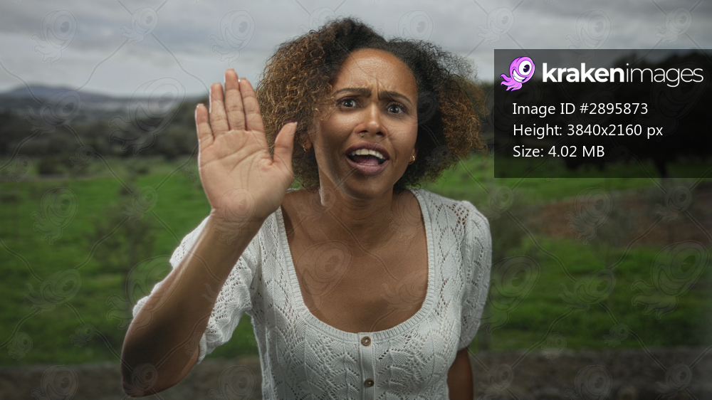 Woman hand raised and shrugged shoulders in field with palms up and puzzled look; confusion question.