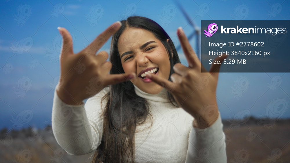 Woman hand rock windmill young latin hispanic field outdoor gesture creates dynamic photo.