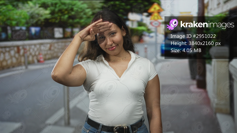 Woman with hand shielding forehead on city street wearing white shirt and jeans smiling; casual confidence.