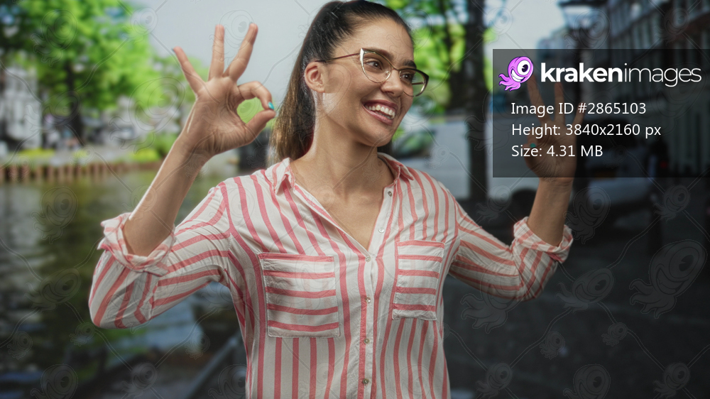 Woman hand shows ok sign on sunlit canal street in amsterdam with water and buildings in view; approval.