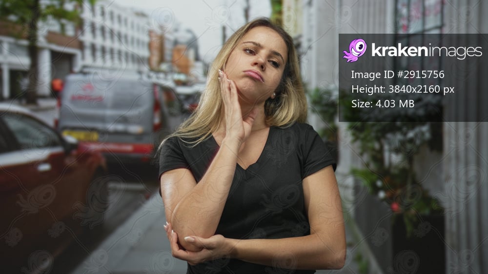 Woman with hand to cheek holding elbow on street near parked cars and storefronts; pensive reflection.