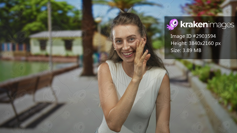 Woman with hand to cheek smiling and laughing on a sunny street by a green park walkway with bench and palm tree; happiness playfulness.