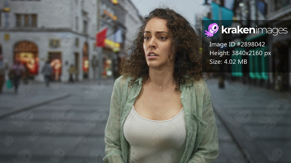 Woman with hand to chest looking over her shoulder on busy city street with storefronts and neon signs; anxiety caution.