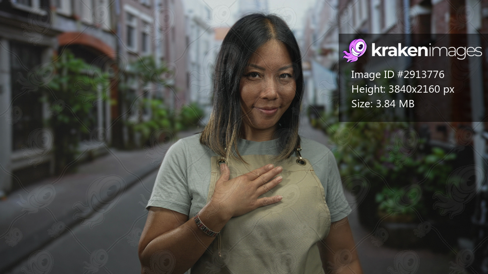 Woman with hand to chest wearing beige apron in narrow street with potted plants and brick storefronts; gratitude resilience trust.