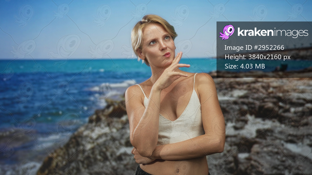 Woman with hand to chin, eyes closed and visible navel at rocky beach, light cami and folded arm while later pointing toward pier; calm contemplation.