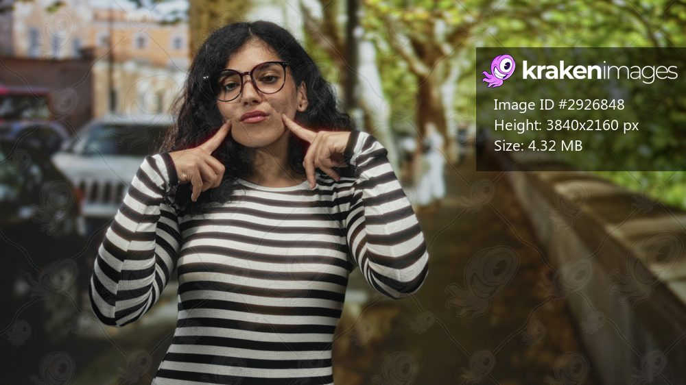 Woman hand to chin and finger to cheek on city street sidewalk near parked cars and trees; playful confidence.