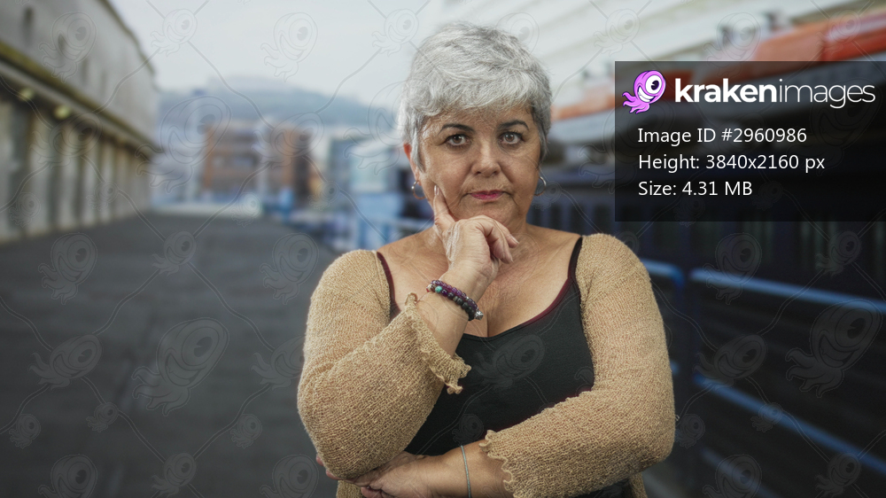 Woman with hand to chin in pensive thinking pose on street beside ship deck and lifeboats, arms folded and wrist bracelets visible; contemplation reflection. - Kraken Images