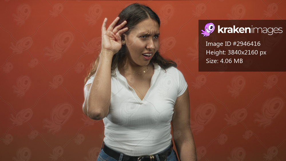 Woman with hand to ear gesture in orange studio wearing white ribbed polo and jeans, cupping ear and leaning forward slightly; curiosity.