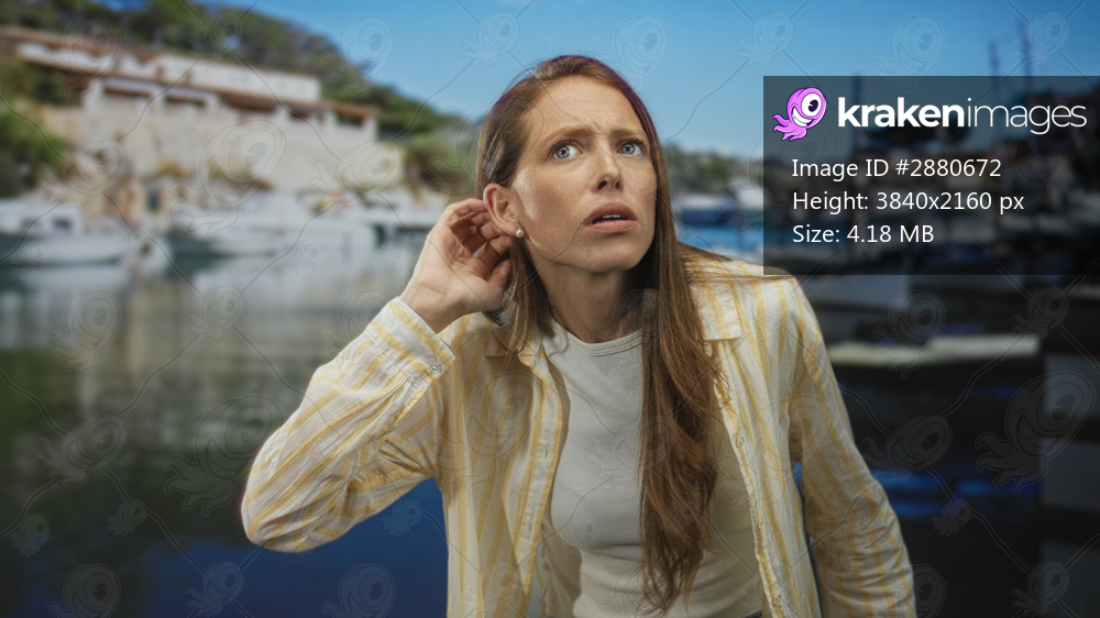 Woman with hand to ear and raised fist in studio port marina set with anchored boats and wooden dock; confusion.