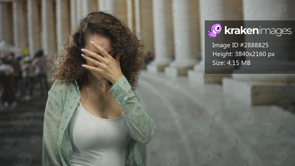Woman with hand to forehead and bare shoulder standing by a building colonnade in old town; concern reflection.