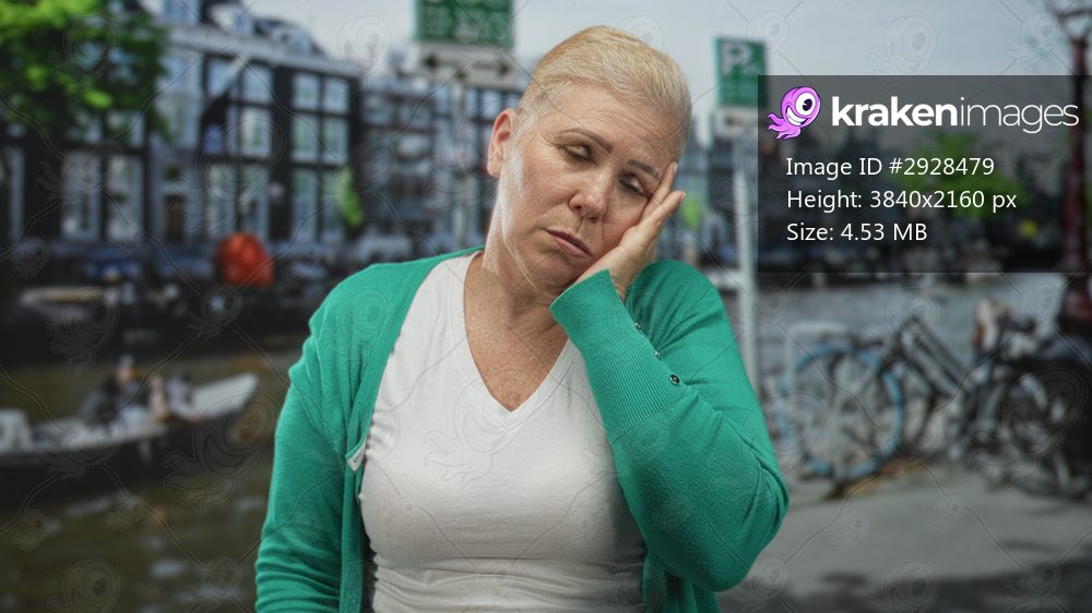 Woman with hand to forehead and closed eyes on street by an amsterdam canal with bikes and buildings in view; fatigue headache.