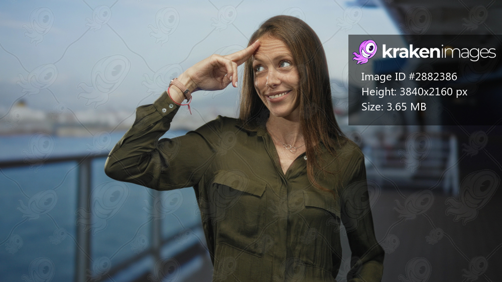 Woman with hand to forehead in a salute gesture on cruise deck near railing, smiling subtly; playful confidence.