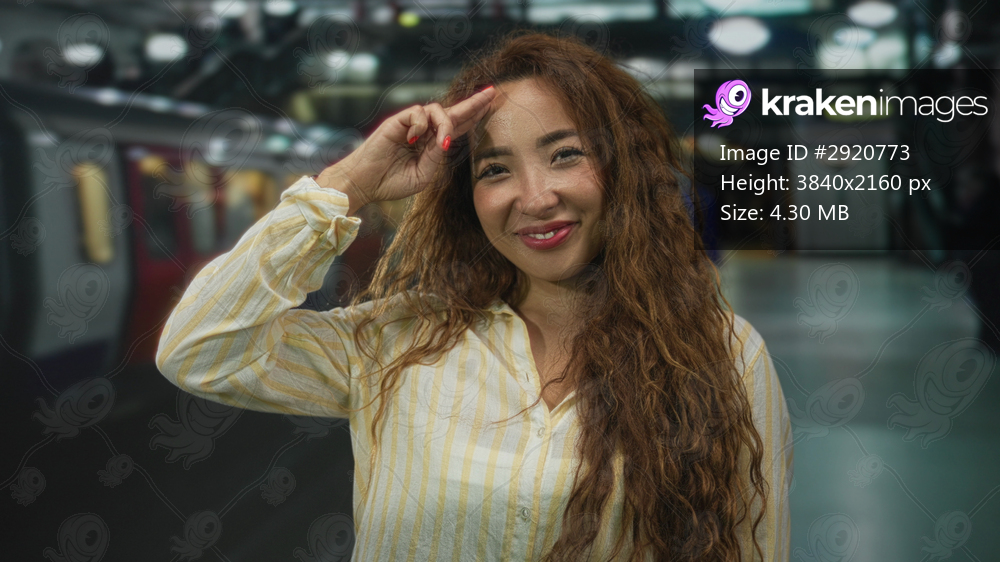 Woman with hand to forehead in station building, smiling at camera on platform beside train doors and lights; cheerful commute.