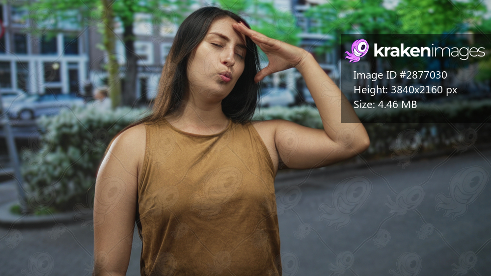 Woman hand to forehead on street in front of row houses and hedges, lips pursed gesture wearing brown sleeveless top; annoyance.