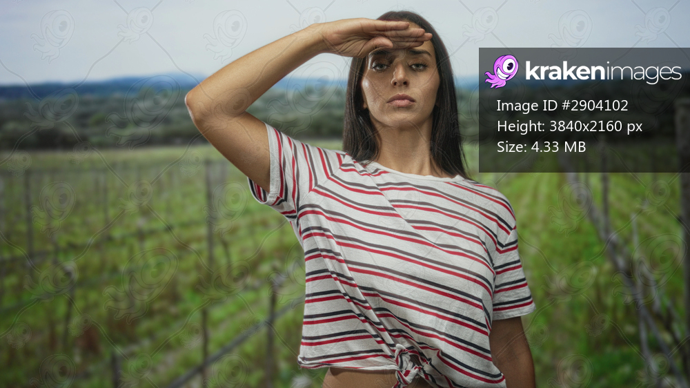 Woman hand to forehead shading eyes in forest vineyard rows with striped shirt and knotted hem exposing midriff; determination.