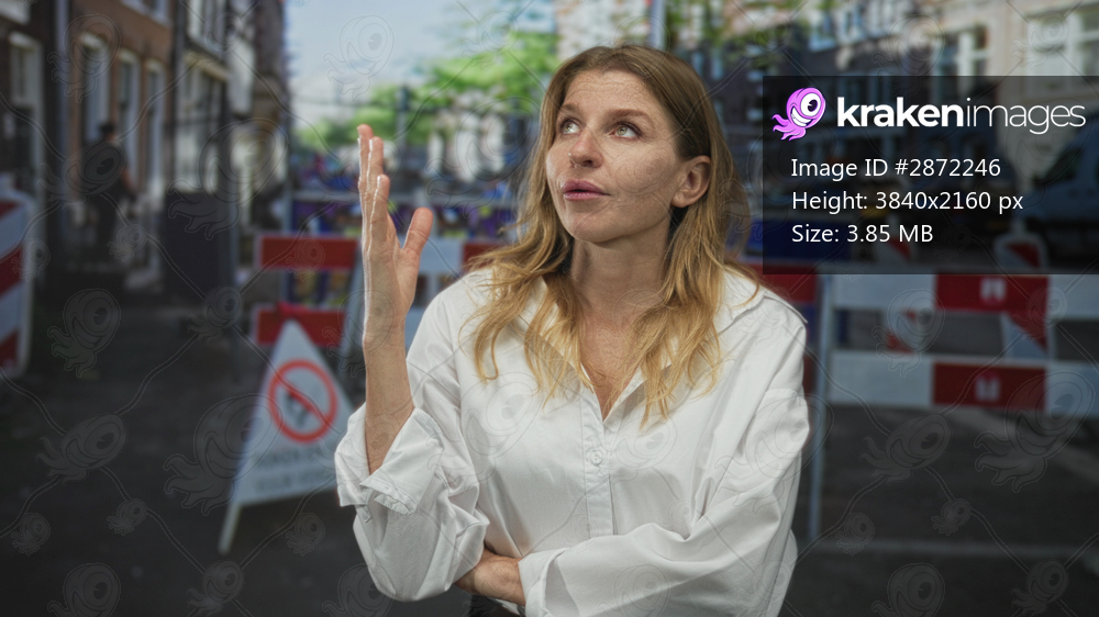 Woman with hand to forehead standing on a city street beside roadworks barriers and signs; frustration commute.