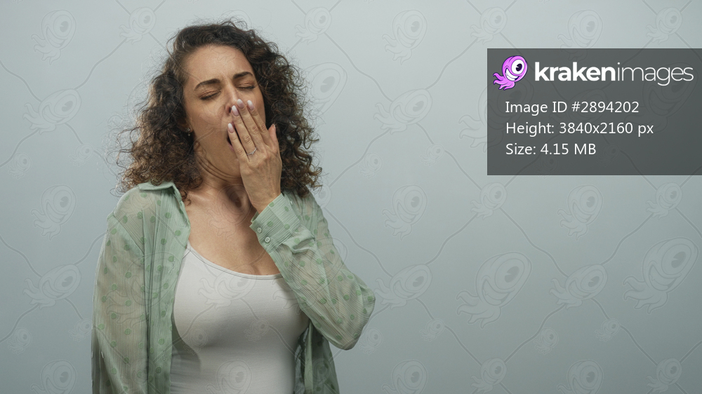 Woman with hand to forehead yawning in light blue studio wearing white tank top and green sheer shirt; fatigue.