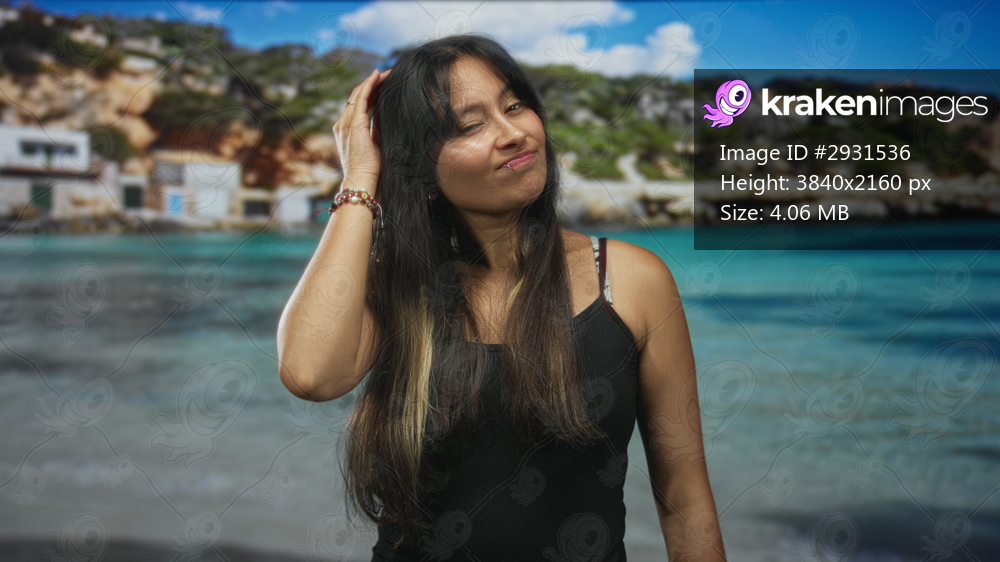 Woman with hand to hair gesture, smirking and facing camera at a beach cove by turquoise water and sand with bracelets visible; playful confidence.