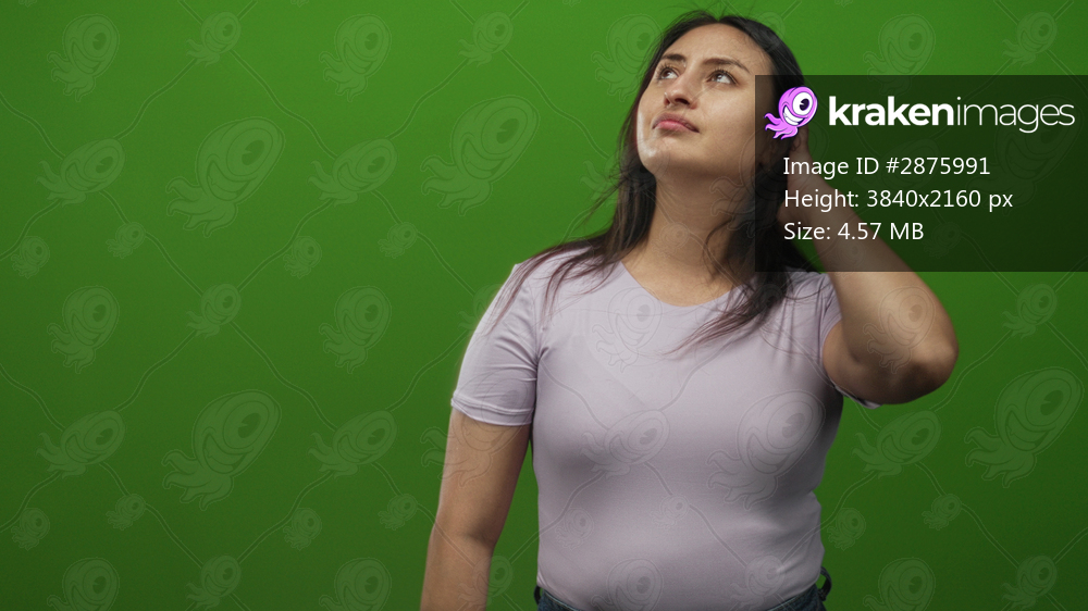 Woman with hand to hair in green studio, casual lilac shirt, gentle smile and turned gaze toward the light; quiet confidence.