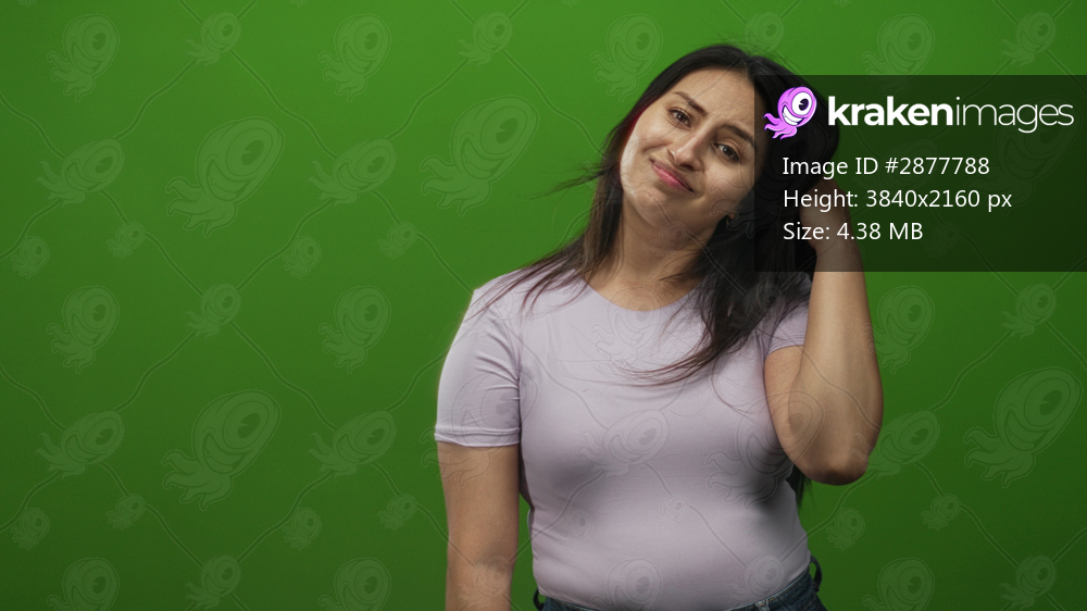 Woman with hand to hair in green studio, casual lilac shirt, gentle smile and turned gaze toward the light; quiet confidence.