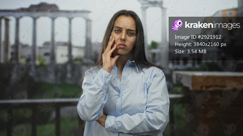 Woman with hand to head for headache at roman building ruins, touching cheek and frowning; distress.