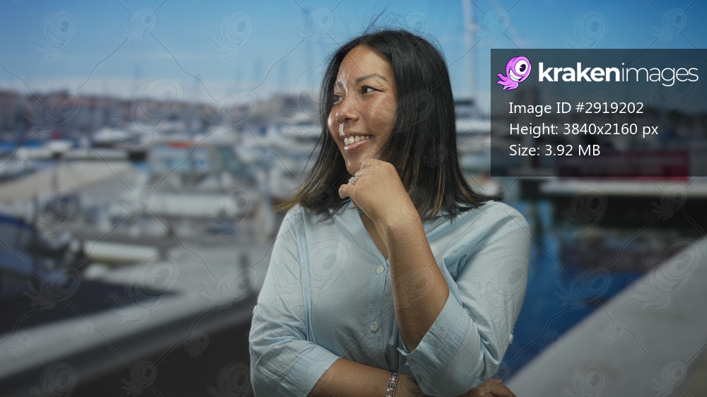 Woman with hand to mouth and arm crossed at marina port near boats and dock on seaside pier outdoors; pensive reflection.
