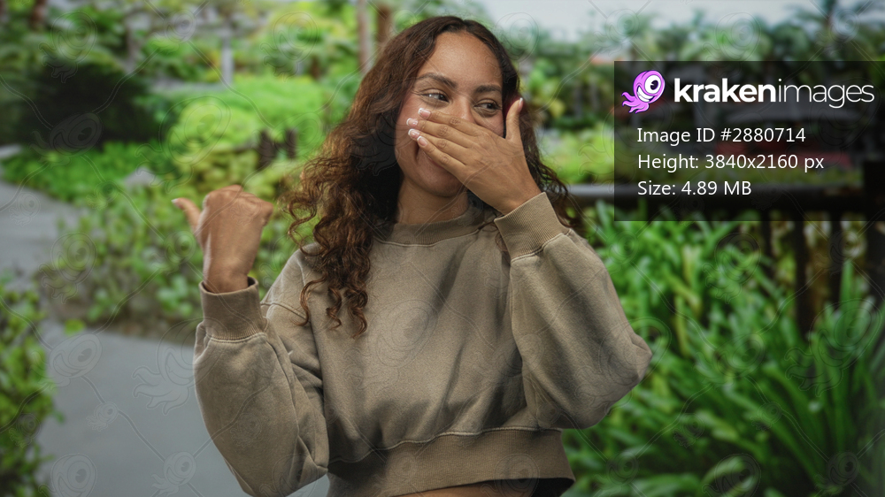 Woman with hand to mouth covering laugh while pointing thumb to self on street walkway lined with green plants and wooden railing; surprise.
