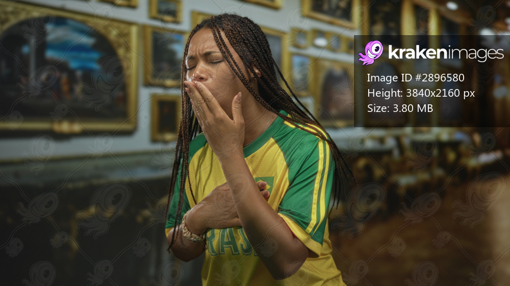 Woman hand to mouth for yawning and hand clutching chest for heartattack in gallery building; fatigue discomfort.