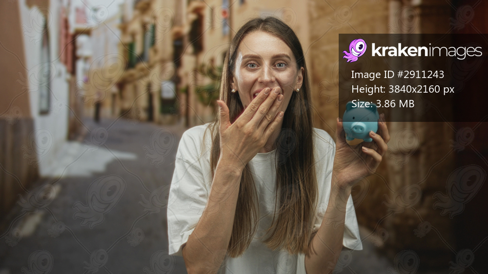 Woman with hand to mouth holding blue piggy bank on a narrow old town street beside sunlit stone building, casual white tshirt; saving surprise.