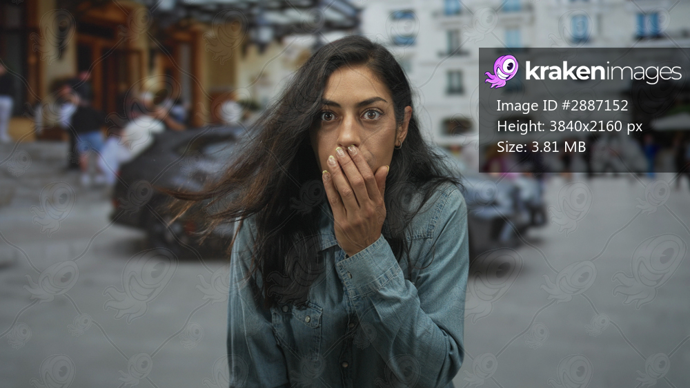Woman with hand to mouth and open mouth gesture in denim shirt on street near parked car and buildings, wide eyed expression; surprise urban moment.